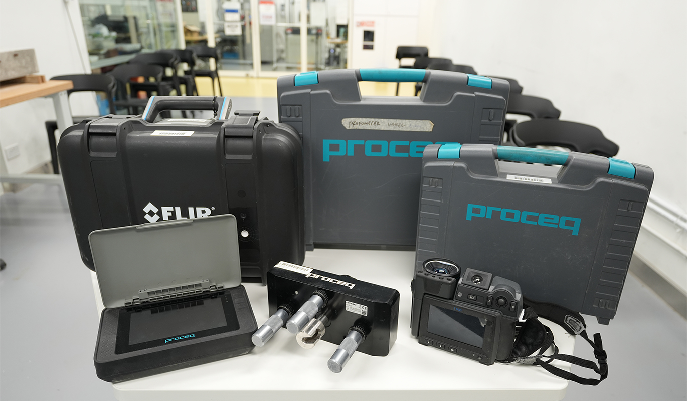 Our NDT testing equipment includes Ultrasonic Pulse Velocity for internal condition testing of concrete, Covermeter for Rebar Detection, Pull-Off Testing, Half-Cell Potential Test, Carbonation Test, Infrared Thermographic Survey, Surface Penetration Radar (SPR) and a (Schmidt) rebound hammer for measuring strengthen of hardened concrete.