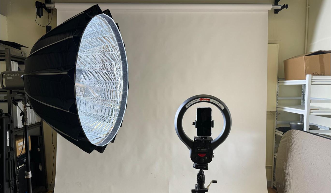 The photo studio provides medium-scale lighting and background setups for capturing high-resolution images of objects or projects.